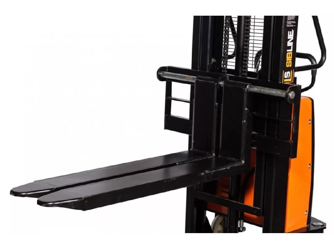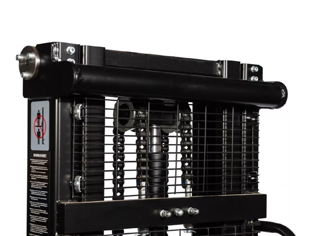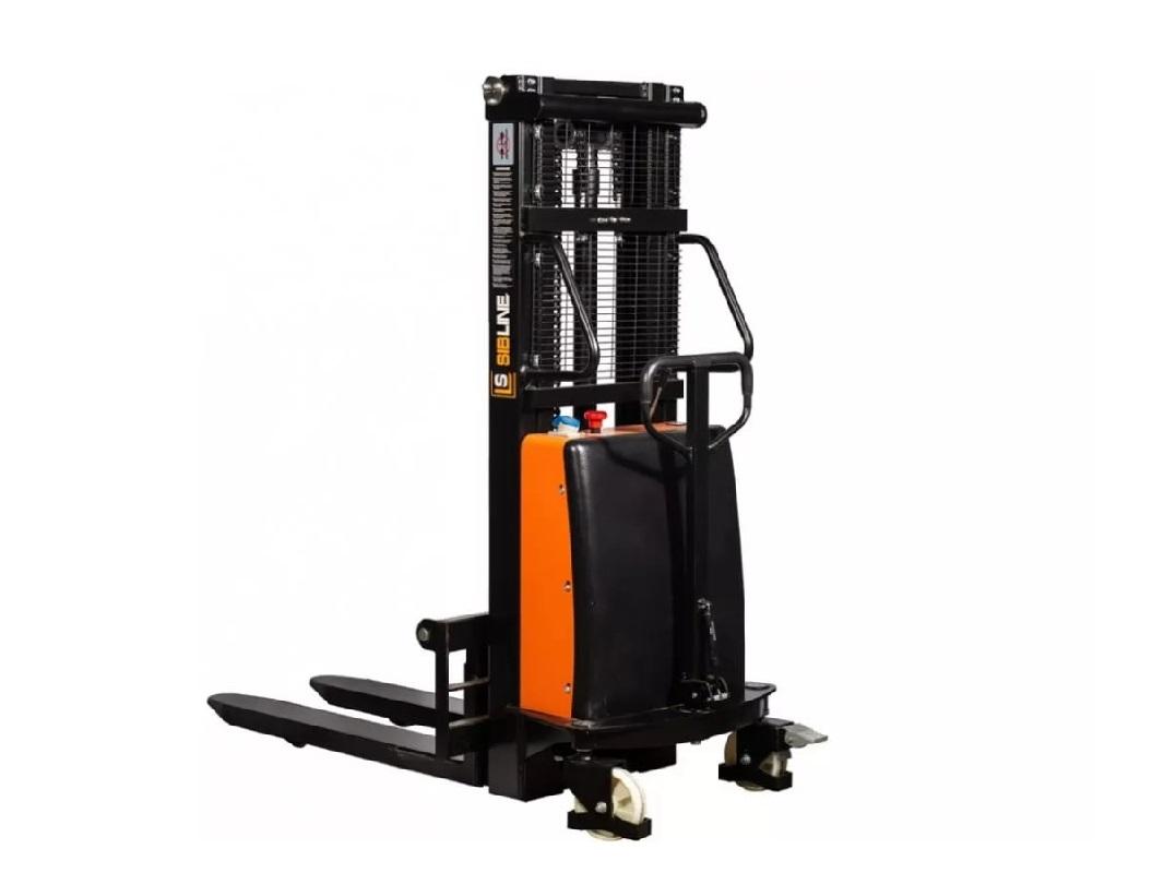Подъём груза осуществляется при помощи электрического компрессора, управление подъёмом и спуском — рычагом на корпусе; по горизонтали — вручную. Наличие электроподъёма облегчает работу оператора и повышает производительность труда. А оптимальная длина опорных вил обеспечивает высокую устойчивость устройства на рабочей площадке. Штабелёр имеет мощную батарею, что позволяет производить быструю подзарядку в перерывах между погрузочными работами. Продолжительность без подзарядки — до 8 часов. Подходит для складов со средней интенсивностью работ. Рекомендуется использовать технику в отапливаемых помещениях на ровных устойчивых поверхностях. Подъём вил осуществляется без выдвижения мачты, максимальная высота подъёма составляет 1910 мм.