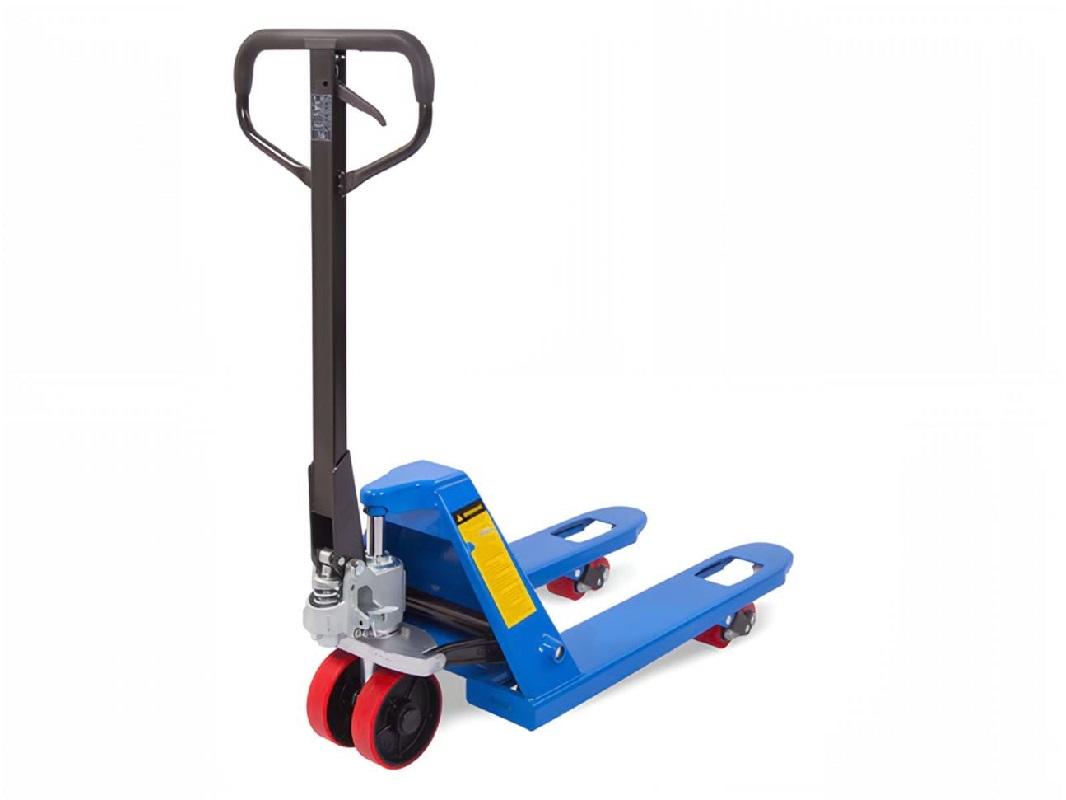 Тележка изготовлена из высокопрочного металла, устойчивого к различным погодным условиям, что позволяет использовать её не только в пределах склада, но и на открытом воздухе. Вилы дополнительно усилены по всей рабочей зоне, что придаёт технике прочность и предохраняет их от деформации, позволяя работать с грузом в интенсивном режиме.